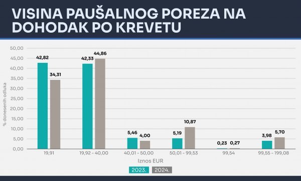 Najniži paušal po krevetu ostao je 19,91 euro, a maksimalni 199,08 eura. Iznajmljivačima je čak smanjena porezna obveza s obzirom na to da na obračunati porez više nisu dužni plaćati prirez.